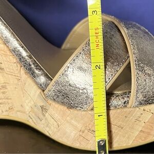 These cracked metallic leather sandals are utterly mesmerizing and filled with beauty. Chic gold straps with a cork wedge. Adjustable ankle buckle. Perfect for summer outings. They'll look great with dresses and casual outfits.