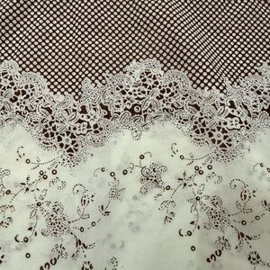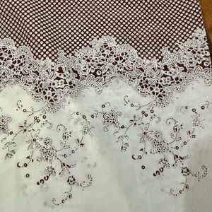 Elevate your style with this chic lace trimmed scarf. Featuring a sophisticated blend of white and brown, made of polyester, it's perfect for any occasion. Measures 42 x 42, in great condition!