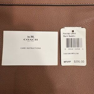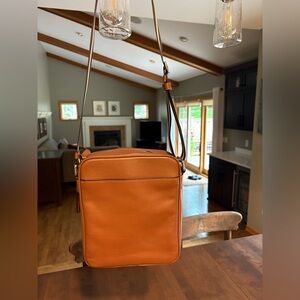 Only carried a few times; still have the tags! 10 inches tall, 9 inches wide, 3 inches depth on bottom. F54782. Rich Brown, leather, strap, cream, and dark blue. Seems on the bottom and strap and interior are in perfect condition. Unisex. I ship quickly and have a smoke free home!