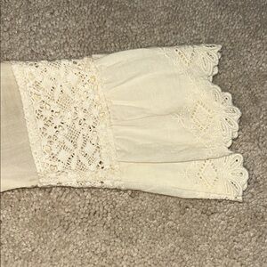 Chic cream blouse with lace accents. Features delicate ruffle hem. Ideal for stylish outings.