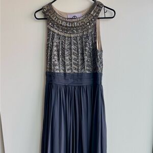 * Fitted through the chest and waist; flared and flowing skirt