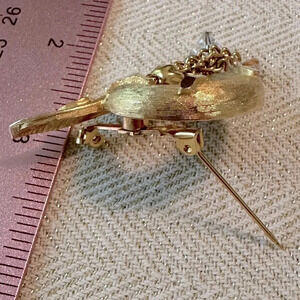 Vintage Brushed Gold Swirl 1970's Tassel Brooch w/ Chain Dangles & AB Crystals