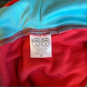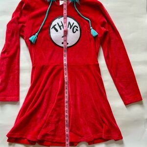 Soft stretchy dress with Thing 1 patch. Red hood with blue fuzzy trim and ties. Striped socks included. Great Condition