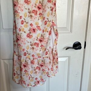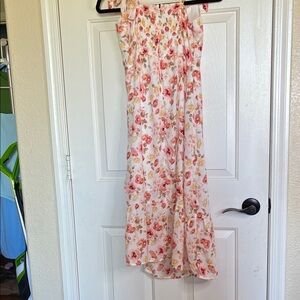 Elegant midi dress with floral pattern. Features tie straps and a stylish side slit. Fairy. Whimsy. Romantic,