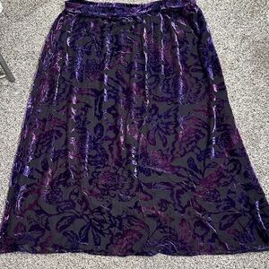 This elegant purple velvet skirt is perfect for any occasion. Its luxurious fabric and rich color make it a standout piece in your wardrobe. Purple black burnout maxi skirt size 2x great condition elastic waist side zipper waist 21 inches length 37 inches