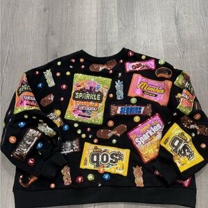 Front and back candy themed sequin black sweatshirt. Runs big. Brand new without tags. Never worn. It was too big for me.