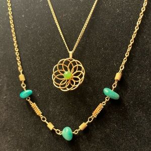 Vintage Gold Tone & Green Stones Necklaces And Enamel Earrings Set