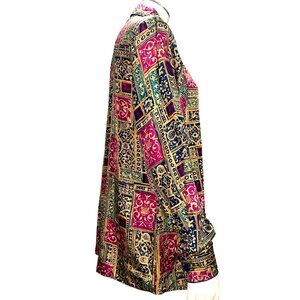 This vintage Anna and Frank silk button-down shirt features a striking jewel-tone patchwork pattern in fuchsia, navy, emerald, and gold. Made from 100% silk with a soft drape and a smooth hand, it reflects the bold maximalist aesthetic of the late 80s and early 90s. Designed with a classic collar, button front, and long sleeves with button cuffs, this statement piece can be worn tucked into high-waisted denim, layered oversized as a streetwear staple, or styled chic for an evening out. A rare gem that blends timeless craftsmanship with modern styling versatility, perfect for the wardrobe of a true classy city chick.