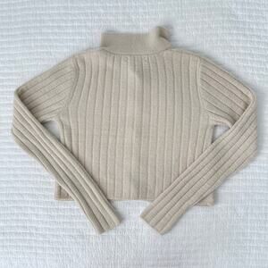 New London Kaye long sleeve, cropped, button-up, knit sweater top in cream / tan, size S.