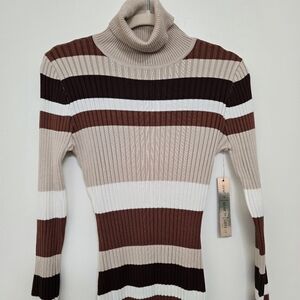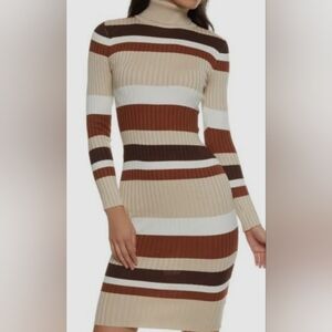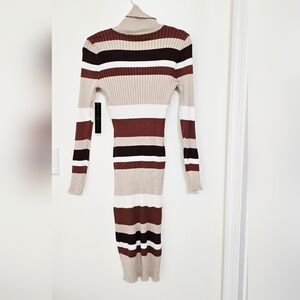 Neutral Tone Striped Ribbed Turtleneck Bodycon Sweater Dress NWT