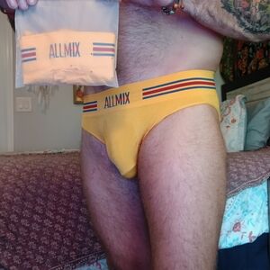 Same as worn by model. Stylish men's underwear in gold and white. Features bold lettering and design.
