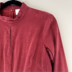 Maeve for Anthropologie Corduroy Mini Dress features a mock neck with keyhole detail. Back zip with two button closure. Long sleeves with zipper detail. Two front slant pockets with snap button closure. Mini length with a swingy skirt. Lined bodice. Add a belt and knee high boots for the perfect autumnal look. NOTE: Belt shown in stock photo not included.
