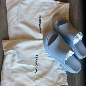 Elegant sky blue mules by Salvatore Ferragamo.