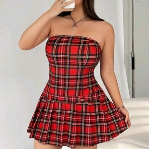 Chic strapless dress with a bold red plaid pattern. Perfect for casual outings or parties. Comfortable and stylish.