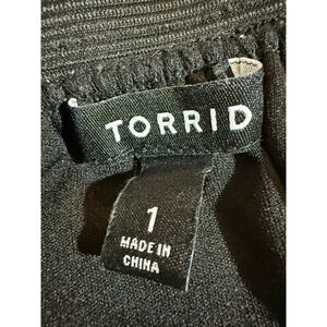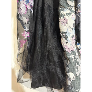 This Torrid A-line skirt, size 1 (equivalent to 1X), features a black elastic waistband and a multi-layered design. The outer sheer mesh shell displays a vibrant floral print in purple, blue, and white tones over a black background. Beneath, there's a solid black lining and an additional tulle layer for volume. Made in China, the skirt's shell 1 and lining are 100% polyester, while shell 2 is 100% rayon. Care instructions indicate hand wash cold. No visible imperfections are present.