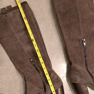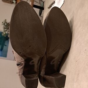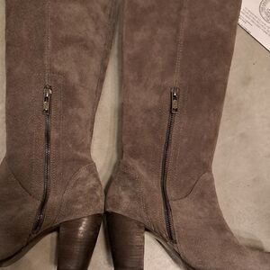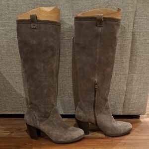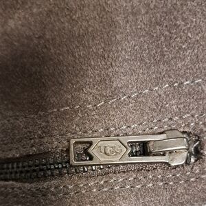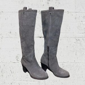 Perfect condition, never worn Chic gray heeled boots by UGG. Stylish and comfortable for any outing. Soft subtle waterproof suede with black stacked heels. Suede interior with ugg's signature sherpa in toe area insures a secure and comfy fit. Almond shaped toe, rubber soles, zip closure. sz 9.5