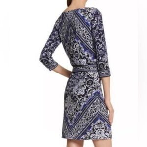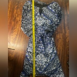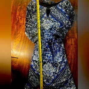The product is a White House Black Market Women's Size Small Blue and White Paisley Dress with a Waist Tie Belt. The dress features a sleeveless design, floral pattern, and a tie closure, making it suitable for a party or cocktail occasion. Made of polyester, this short fit and flare dress is designed with a belted waist, adding a stylish touch to the overall look. Perfect for women looking for a chic and feminine outfit with a unique flower theme.