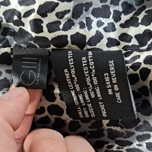 It's a great classy moto jacket. Front pockets zip up. Zips down for a callor look or you can zip it up for a high neck closure. It is more of a structure, tailored fit, cropped, relaxed fit. The leather is a lightweight, soft material. Genuine leather. A nice brown earthy tone color. Satin animal cheetah print. It's such a great causal coat, jacket.