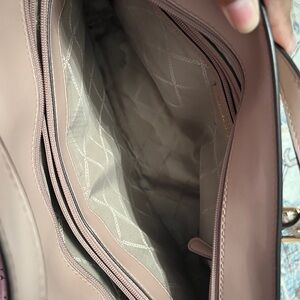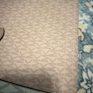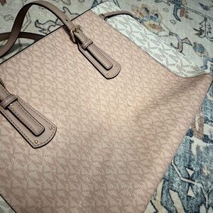 Chic Michael Kors tote with pink and cream tones. Features signature MK pattern. Ideal for everyday use.