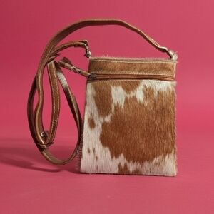 Chic cowhide bag with a tan and white design. Ideal for everyday use.