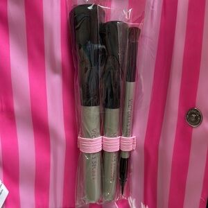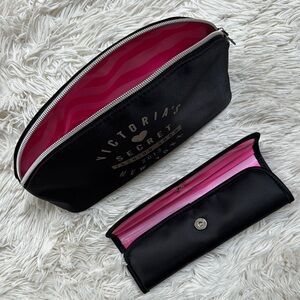 Victoria's Secret Cosmetic Bag & Brush Set in Black and Silver with Pink Stripe Interior. Three brushes new in packaging in a beautiful trifold clutch bag.