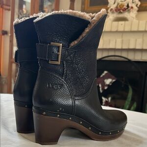 Pre-Loved Chic black leather boots with warm brown shearling cuff. Ideal for winter wear. Item is in smoke pet free home. Thank you for viewing!