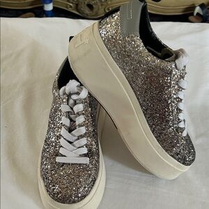 Pre-Loved Shimmering silver glitter design. Black accents. Sturdy white sole. Item is in smoke pet free home. Thank you for viewing!