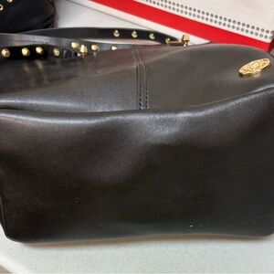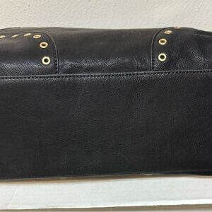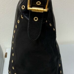 Elegant black shoulder bag. Features gold eyelet accents. Stylish and versatile design.