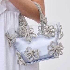 Exterior Details: Transparent Design, Rhinestone Flower Details, Knotted Rhinestone Handle, Silver Hardware