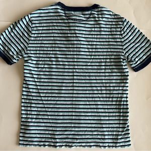 Polo Ralph Lauren short sleeve teal/blue/white striped shirt. Henley three bottoms. Soft 100% cotton. Size L (14-16). Very good. Gently used Preowned condition.
