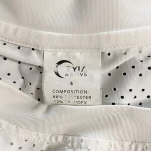 Zyia Active sleeveless tank top in women's size small. Off white, cream color. Perforated. Stretchy 88% polyester 12% spandex. Machine washable. Fading to brand tag. Otherwise, great condition!