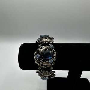 Vintage silver & blue rhinestone chunky ornate mid century bracelet 7"X1.25" & clip earrings excellent condition