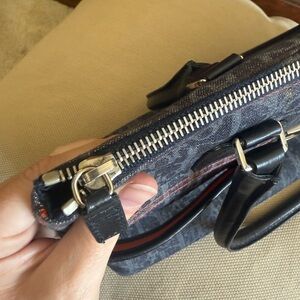 Material: Denim-patterned canvas with leather trim and silver-tone hardware