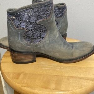 Stylish gray leather booties with unique cutout design. Perfect for versatile wear.