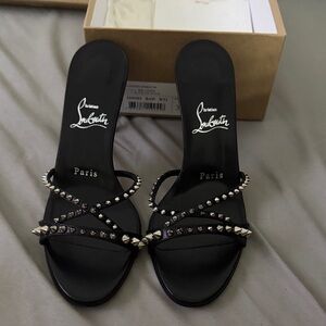 Chic black heels with iconic red soles. Embellished with bold studs.