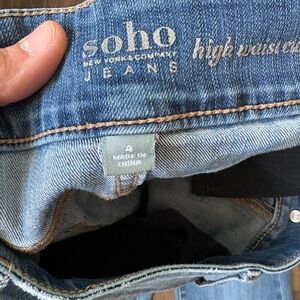 High-waisted, stretchy, and flattering for curves. These jeans are pretty worn but still in good condition—perfect for casual, everyday wear!