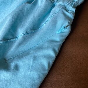 Lululemon light blue shorts size 8. Small zipper pocket on front left. Minimal wear marks.