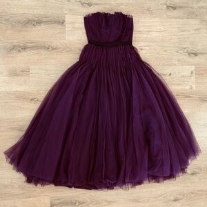 This elegant strapless gown by Zac Posen offers timeless sophistication with its rich purple hue and voluminous tulle skirt. Enhance the romantic feel with delicate jewelry and strappy heels. Prom dress, formal events, weddings, and more.