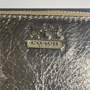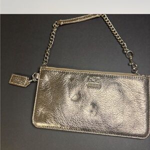 Elegant wristlet with a shimmering finish. Features a stylish chain strap. Ideal for versatile use.