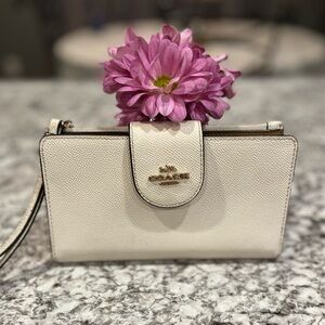 Excellent condition Coach Peyton Clover and monogram hand bag. Clean throughout and has hang tag. Interior and exterior pockets. Please see all photos for any wear as shown.