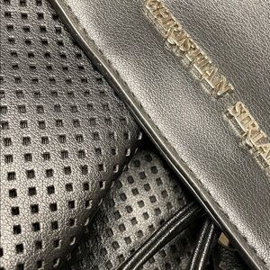Elegant black leather backpack by Christian Siriano. Features perforated detailing and drawstring closure.