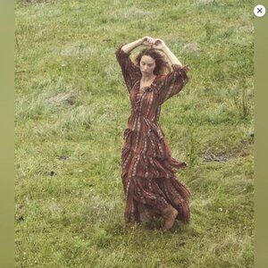 DÔEN Marlanna Silk Chiffon Boho Maxi Dress, Brown/Orange, Size XS, NWT
