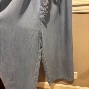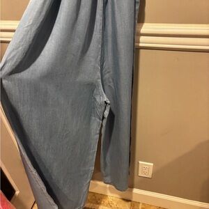 Stylish blue sleeveless jumpsuit. Features a tie belt for a flattering touch. Can wear to any warm vacation, dressy event like grad parry, bridal shower, baby shower, girls night out or birthday event. Pair with a fun wedge sandal, heel or flat. Has wide leg and is a light flowy material.