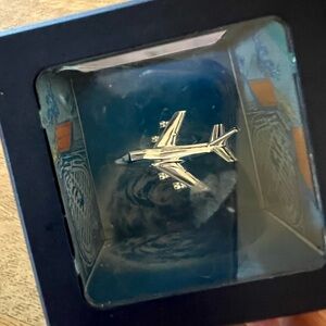 Unique Art Bank coin box featuring a whimsical flying plane design. Measures 3.75” square. Decorative and collectible — a fun way to save coins while adding artistic flair.