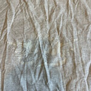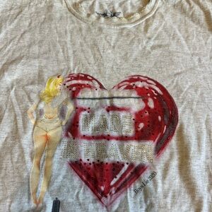 This stylish gray shirt features a vibrant heart design, perfect for adding a touch of fun to any outfit. Comfortable and easy to wear, it's a great choice for everyday adventures. Very worn and rhinestones missing but still super comfy