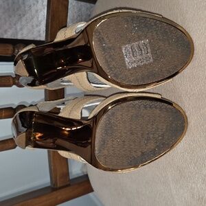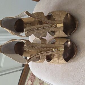 EUC. Step out in style! Elegant, textured leather tan upper with shiny copper colored, 3.5" high heels & front zippers. 1st photo best represents color. Perfect for any occasion, these shoes offer both comfort & sophistication. Smoke free home.