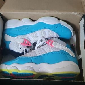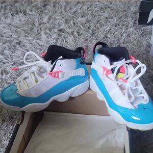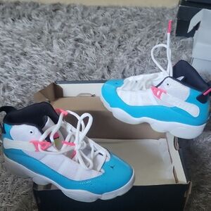 Vibrant Jordan sneakers for kids. Features blue, white, and pink accents. Ideal for active play.