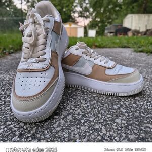 Stylish Nike sneakers in white, tan, pink, blue, and eggshell. Perfect for anytime. Pair with your sundresses, jeans, shorts, rompers etc. These are in excellent condition worn only a few times. They are a bit dirty on the back of the cloth upper heel, see in the pictures.