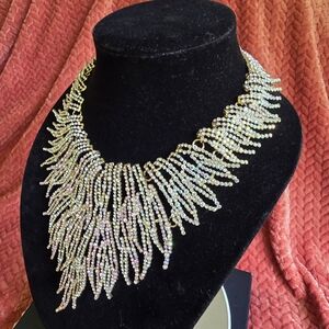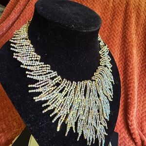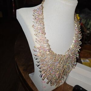 This stunning sought after Natasha necklace features a dazzling array of gold and silver tones, smothered in Aurora Borealis rhinestones. Rainbows of sparkle at every angle...perfect for adding a touch of elegance to your attire. With a 5 inch extender. Its intricate design is sure to catch the eye and make a statement.