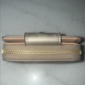This stylish tan wallet features a charming heart turn lock closure, perfect for adding a touch of elegance to your accessories. Ideal for everyday use, it combines functionality with a chic design. As Is Sale. Please examine all pictures prior to purchase.